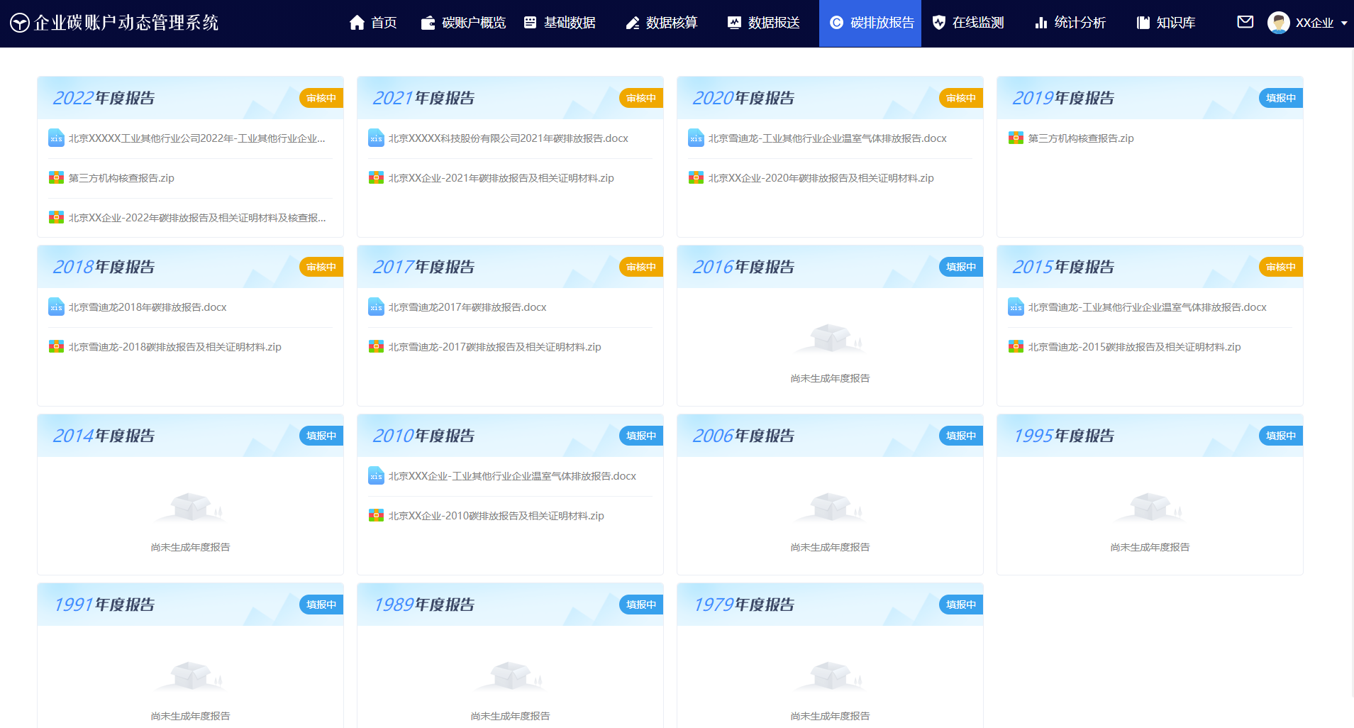 Intelligently generates annual carbon emission reports, and provides functions such as downloading and progress viewing.