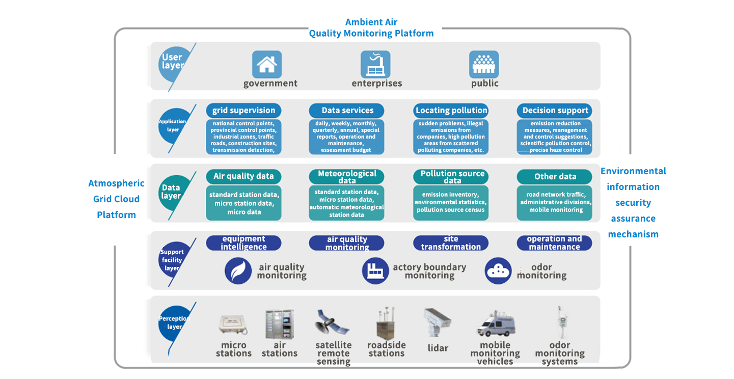 The atmospheric environment grid supervision solution uses fixed equipment monitoring, satellite remote sensing monitoring, lidar monitoring, navigation monitoring and other technical means to build an atmospheric environment monitoring network with wide coverage, focused focus and reasonable density, and obtain massive and accurate information. Air quality and meteorological monitoring data, based on the Internet of Things, cloud computing and big data analysis technology, build a new atmospheric environment supervision model of "end + cloud + service" to achieve real-time monitoring, dynamic early warning, rapid positioning, timely management, and big data Decision-making and other functions promote the transformation of air pollution prevention and control from experience-based, feeling-based, and extensive management to grid-based, real-time, and precise management, and provide users with multi-faceted services from monitoring systems, mobile applications to data analysis.