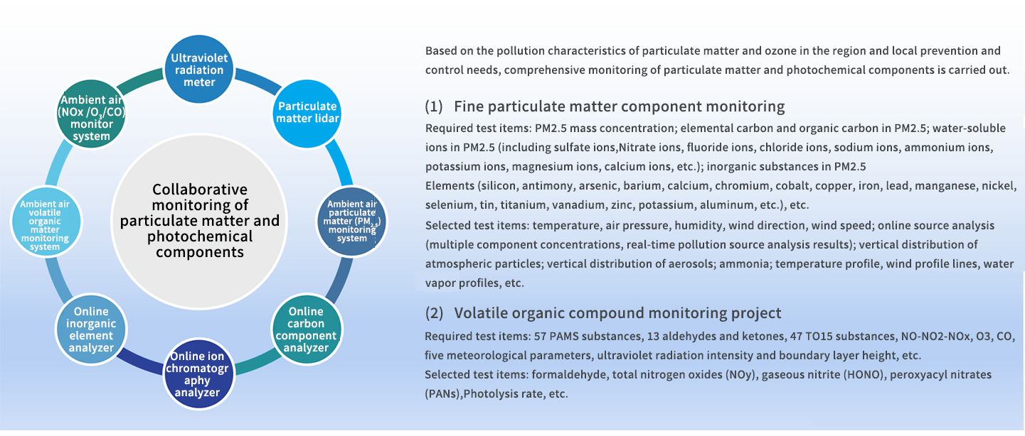 The atmospheric particulate matter and photochemical component network monitoring solution is based on the "14th Five-Year Plan National Capacity Building Plan for Fine Particulate Matter and Ozone Collaborative Control and Monitoring Network" (Environment Office Monitoring Letter [2021] No. 218) to monitor key areas for air pollution prevention and control, and VOCs emissions. Cities with high levels of ozone and excessive ozone will carry out collaborative monitoring of PM?.? and photochemical components, improve the regional collaborative control and monitoring network, fully play the role of monitoring support and support, and assist the coordinated management and control of PM?.? and O? in the region.