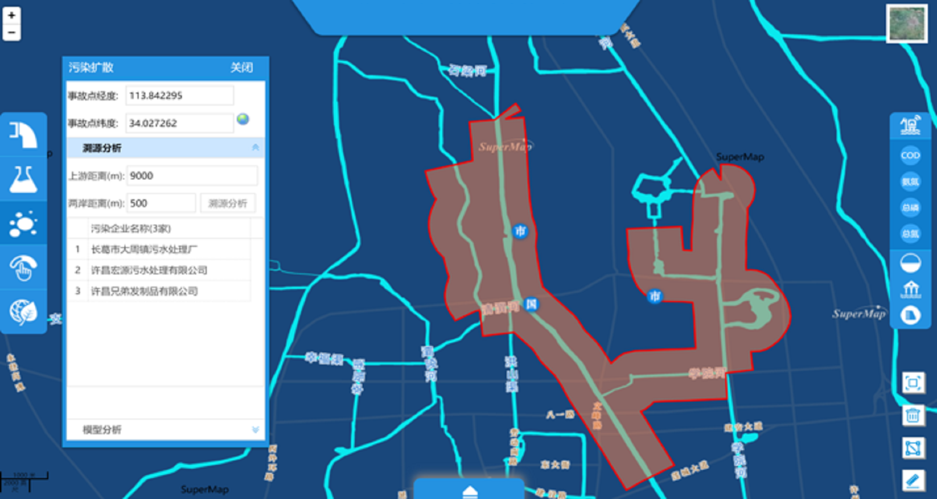 實現(xiàn)了與各環(huán)境管理部門之間的數(shù)據(jù)共享交換;基于二三維地圖,立體展現(xiàn)污染源空間分布;實現(xiàn)了許昌市水環(huán)境監(jiān)控、預警、應急、污染決策的數(shù)字化、智能化。