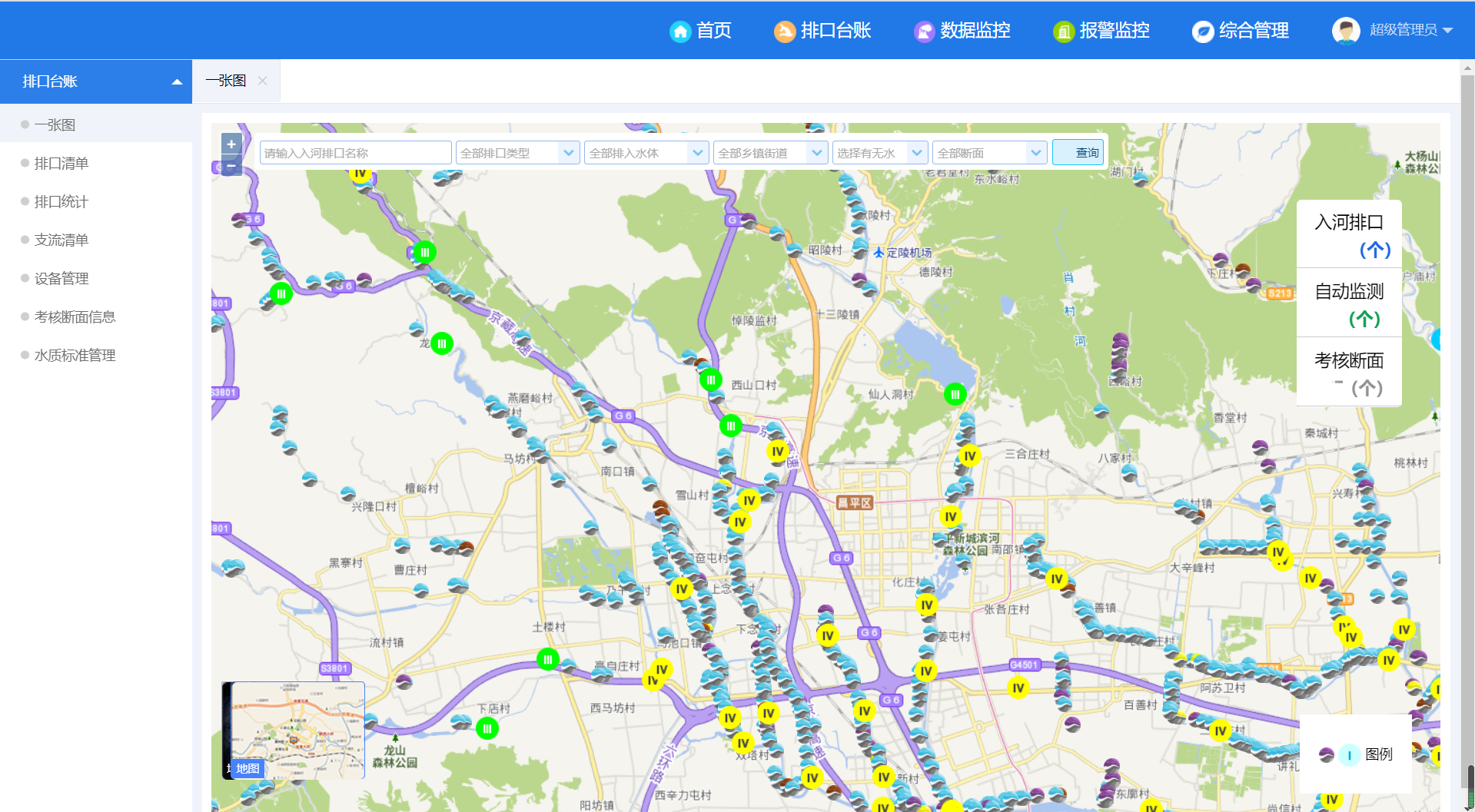 實現(xiàn)“一張圖”集中展示;實現(xiàn)對昌平入河口水質(zhì)水量的實時動態(tài)監(jiān)控;實現(xiàn)對異常數(shù)據(jù)的識別與及時告警;實現(xiàn)對昌平入河排污口的檔案電子化管理。